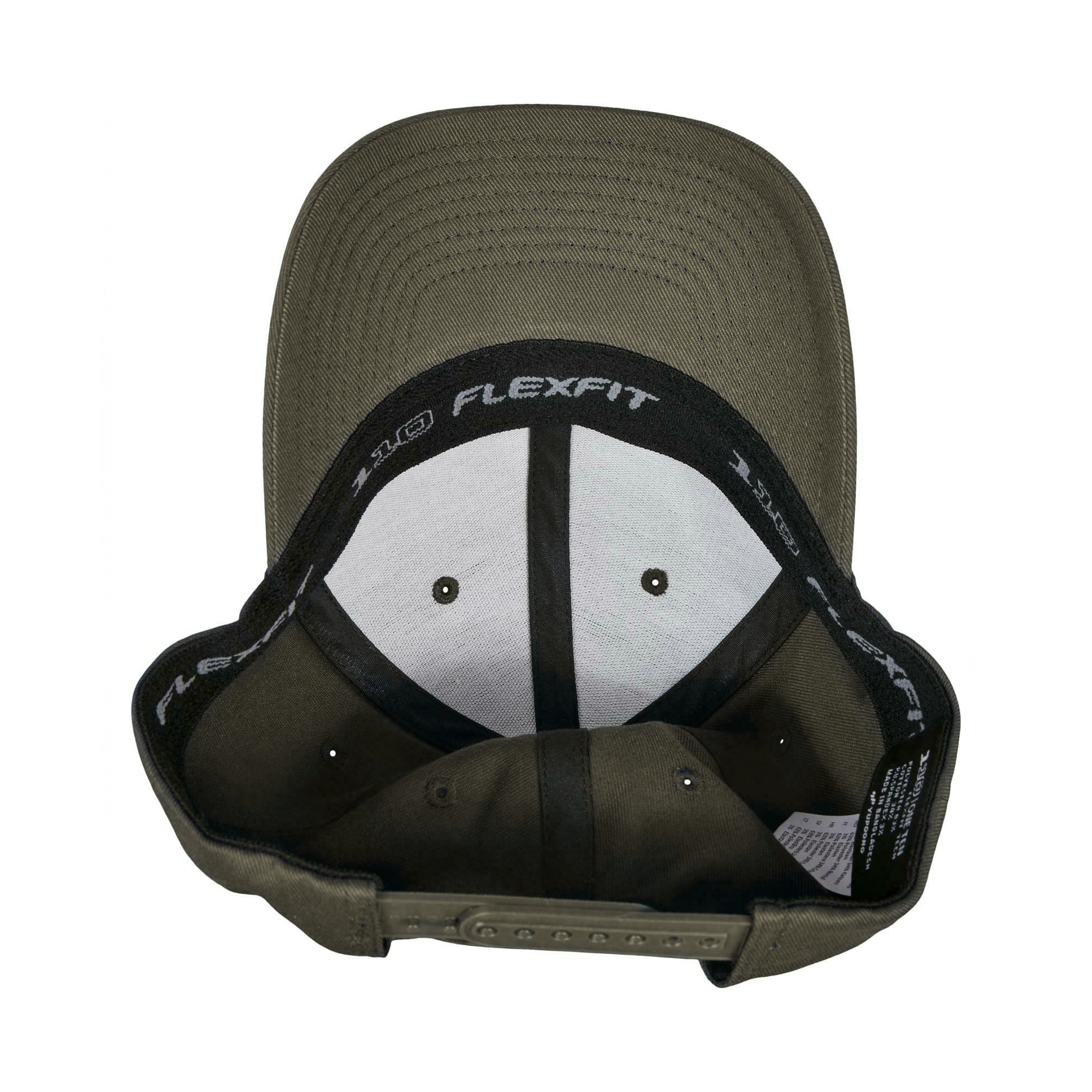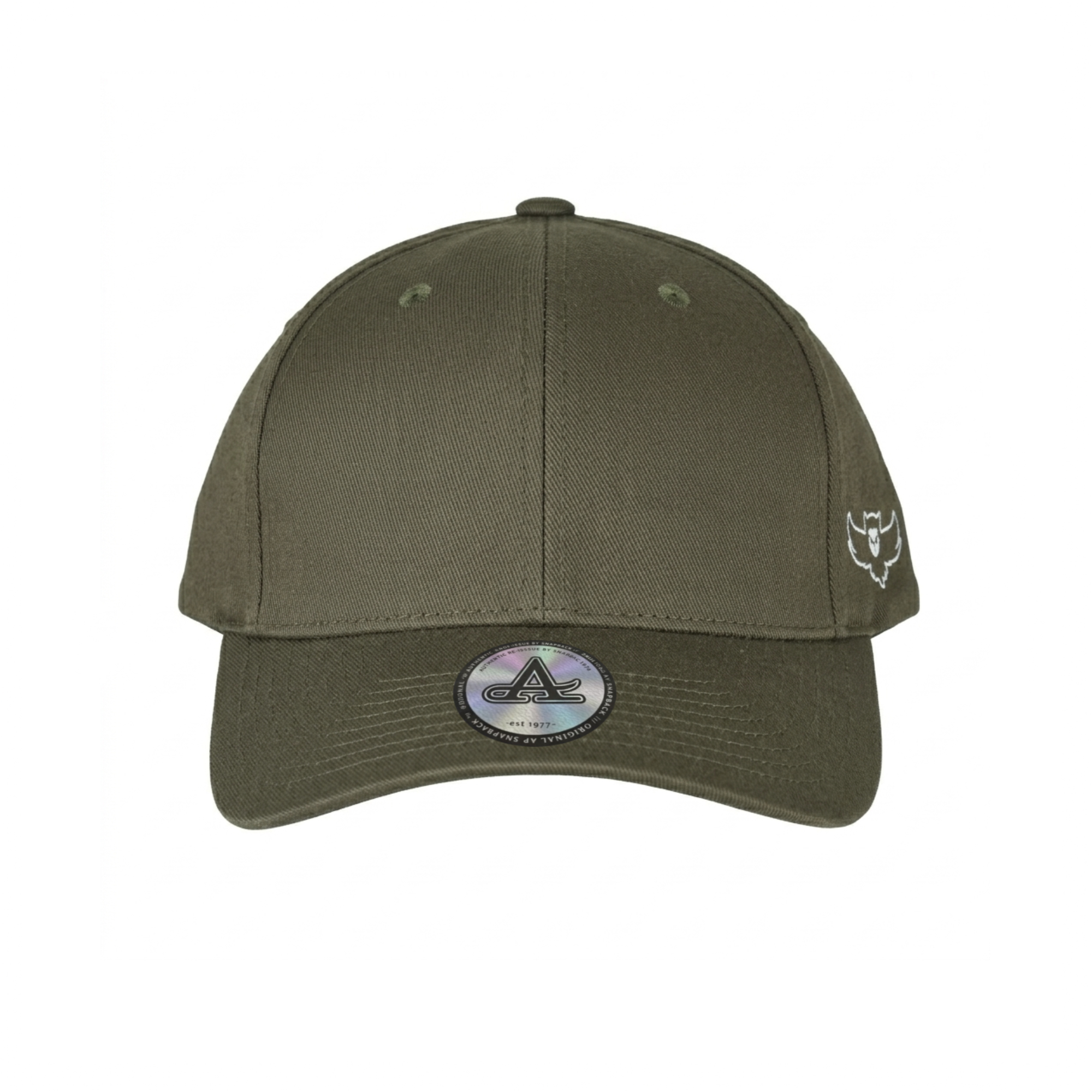 (NEU) Olivfarbenes 6 Panel Flexfit-Snapback mit dem bedruckten OWL Symbol Logo auf der Seite in weiss.